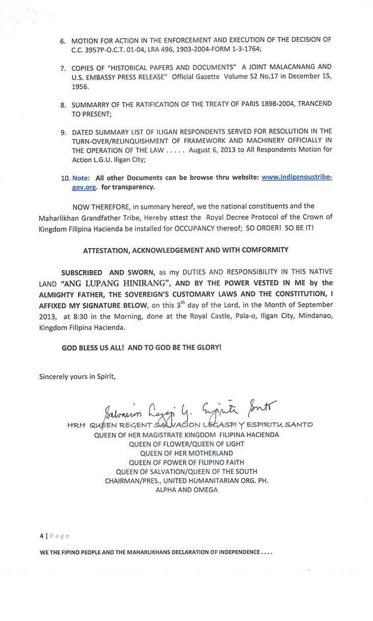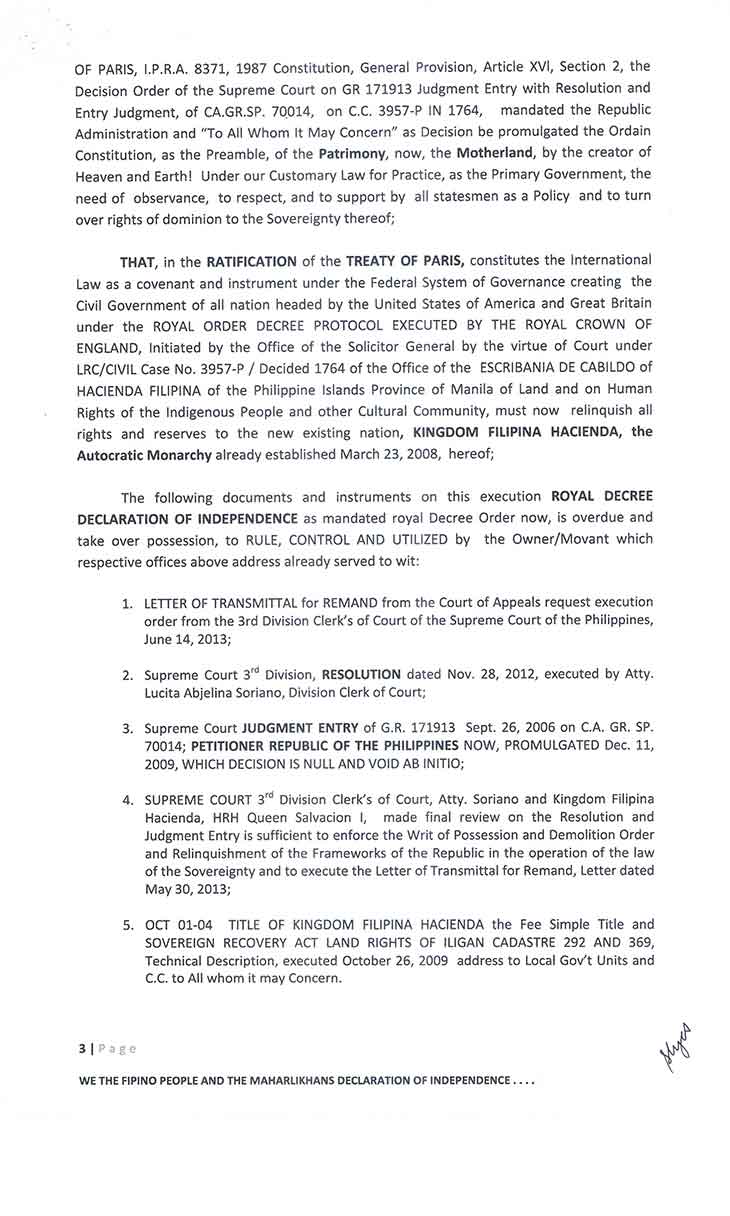 • TREATY OF PARIS BOOK OF REDEEMPTION DEMAND FOR RELINQUISHMENT TO THE SOVEREIGNTY: FOR THE WHOLE FILIPINO PEOPLE AND THE MAHARLIKHAN TRIBE