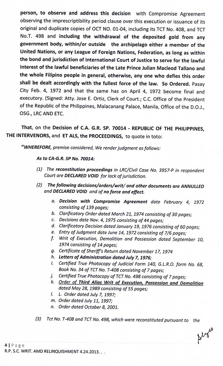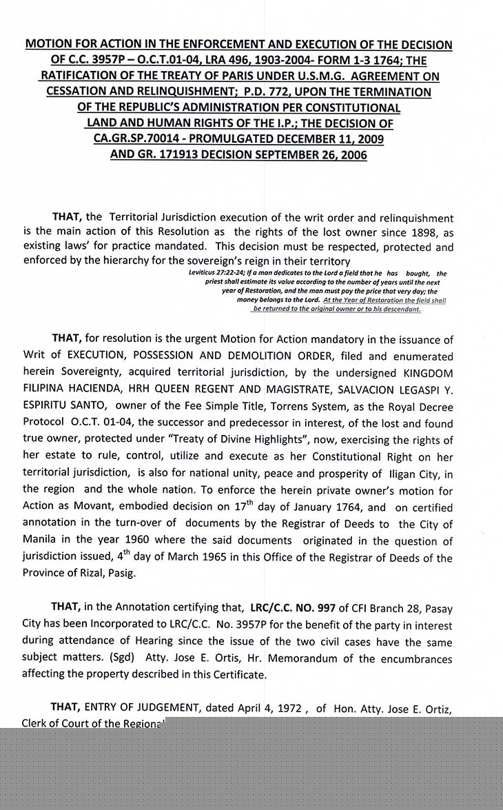 • PASAY RTC SHERIFF'S ORDER COURTS' DECISION ON C.A.G.R.SP. 70014 JUDGEMENT ENTRY G.R. 171913 FOR RECOVERY AND RELINQUISHMENT ON O.C.T. 01-04 - C.C. 3957P. T.O.P. TORREN SYSTEM