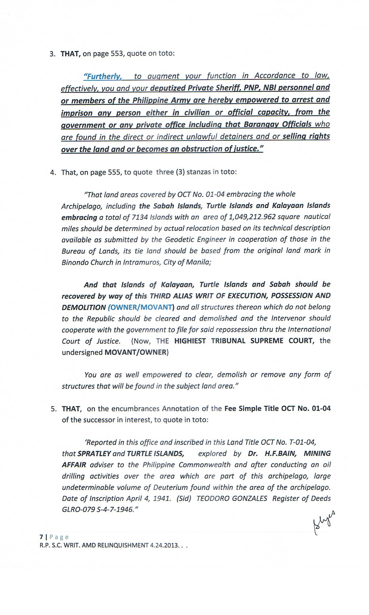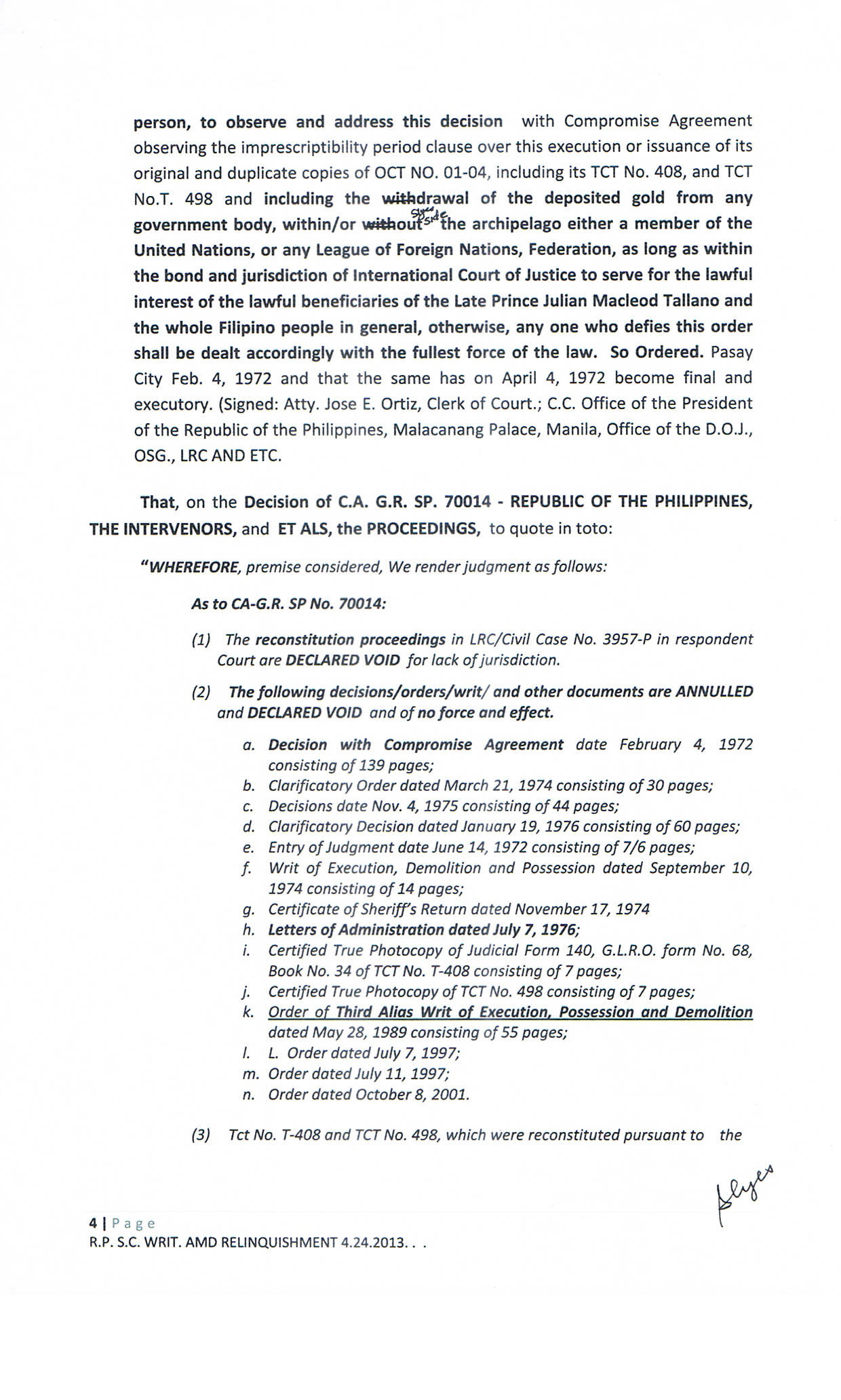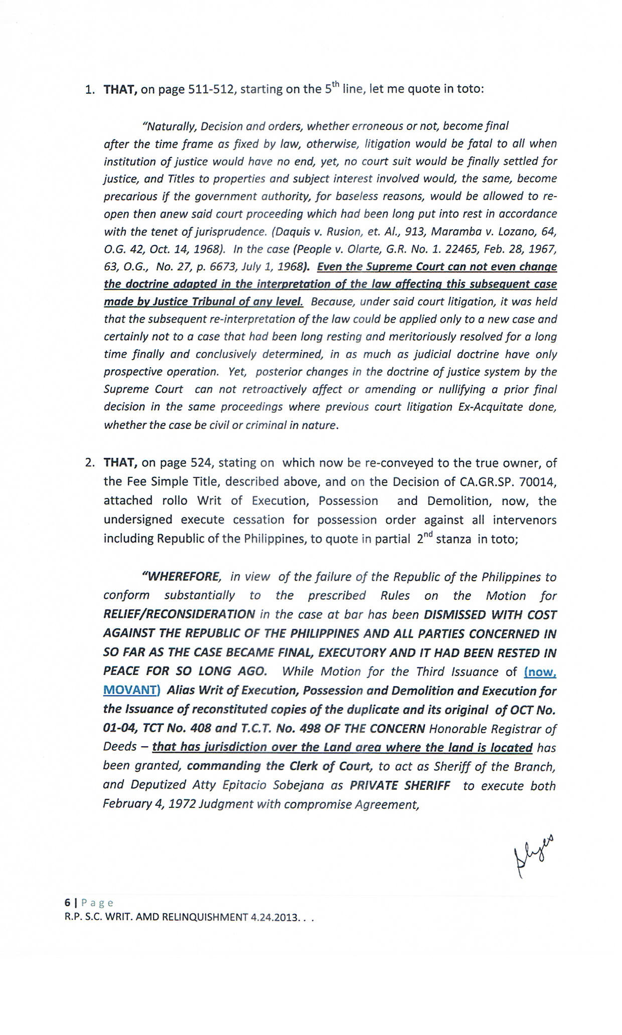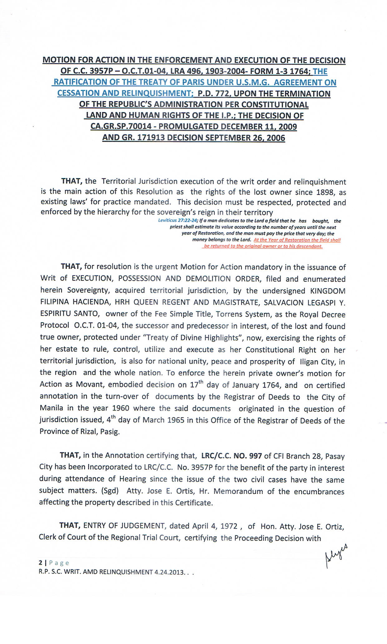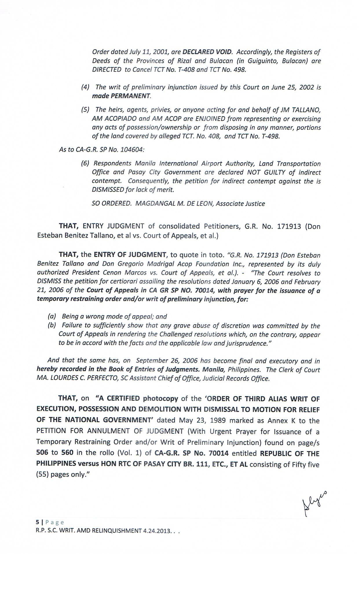 • PASAY RTC SHERIFF'S ORDER COURTS' DECISION ON C.A.G.R.SP. 70014 JUDGEMENT ENTRY G.R. 171913 FOR RECOVERY AND RELINQUISHMENT ON O.C.T. 01-04 - C.C. 3957P. T.O.P. TORREN SYSTEM
